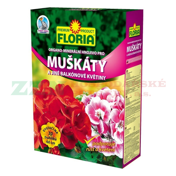 FLORIA Organominerální hnojivo pro muškáty se používá k základnímu hnojení před výsadbou a k přihnojování všech druhů muškátů v průběhu vegetace. Jeho důležitou složkou je Guáno, což přírodní surovina velmi ceněná pro svůj vysoký obsah fosforu v dobře přijatelné formě. Část živin v hnojivu se uvolní okamžitě, a část pozvolna. Tím se snižuje riziko poškození rostlin. Vysoký podíl organických látek přispívá k oživení mikrobiální činnosti půdy a zlepšení půdní struktury. Zvyšuje její úrodnost a ovlivňuje bohaté kvetení muškátů.