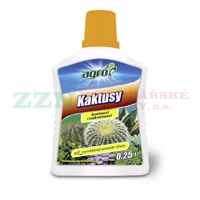 Agro KAKTUS je kapalné hnojivo pro kaktusy a sukulenty. Je ideálním přípravkem pro přihnojování kaktusů a ostatních suchomilných rostlin (kaktusy, aloe, agáve, opuncie, trnové koruny…). Optimální poměr živin podporuje zdravý vývoj rostlin a zároveň přispívá k bohatému nasazení poupat a k tvorbě listové zeleně. Toto jedinečné kapalné hnojivo má zvýšený obsah fosforu pro bohaté kvetení a nízký obsah dusíku pro minimální růst.