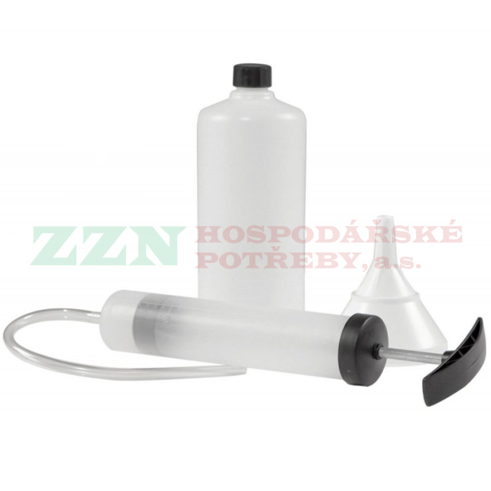• Sada obsahuje stříkačku s hadičkou, trychtýř a nádobu s uzávěrem.