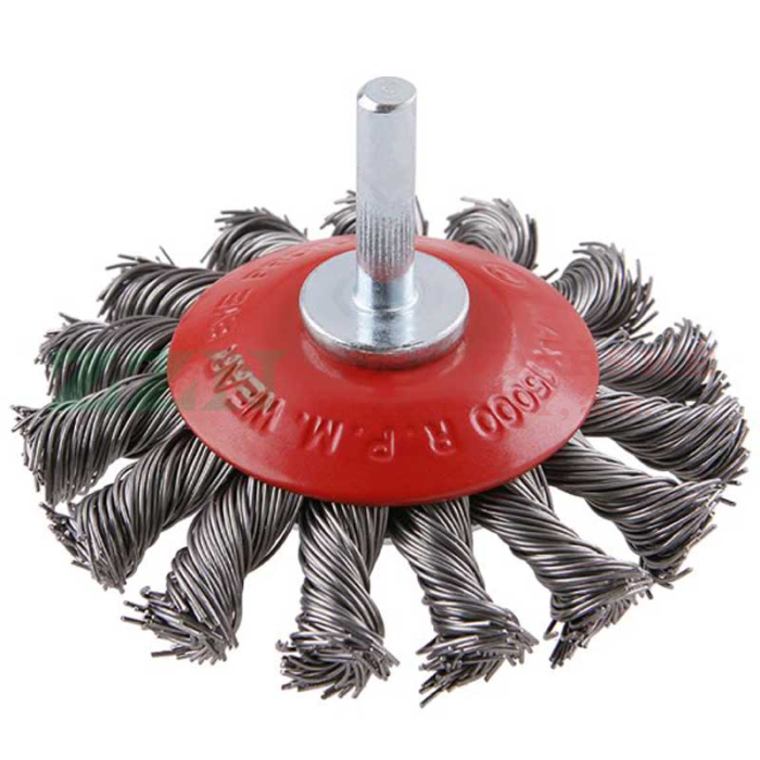 Miskový rotační kartáč s ocelovými copánky o průměru 75 mm a stopkovým uchycením.