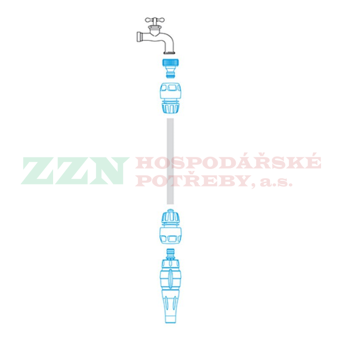 Sada pro zavlažování obsahující zahradní nastavitelnou trysku, adaptér na kohoutek a hadicové spojky.
