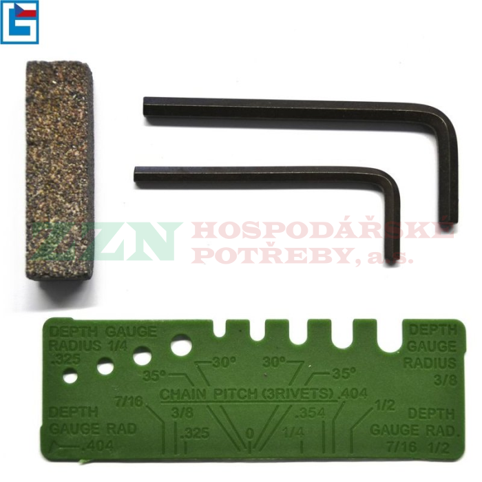 Jemné seřízení / spolehlivé upevnění broušeného řetězu, oboustranné ostření všech článků řetězu díky naklápěcí brusné hlavě (90 - 50°) a otočnému upínacímu mechanizmu, vodicí rukojeť pro přesné navádění brusného kotouče k ostřeným zubům.