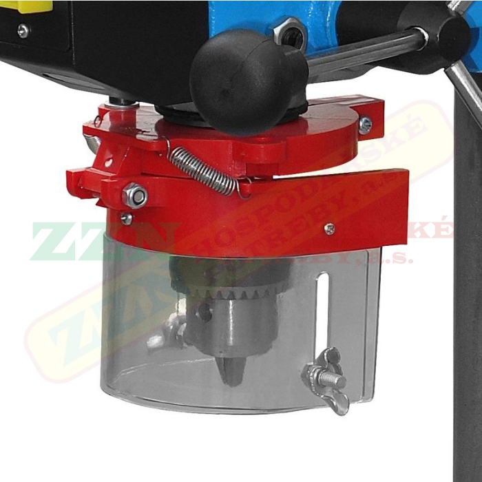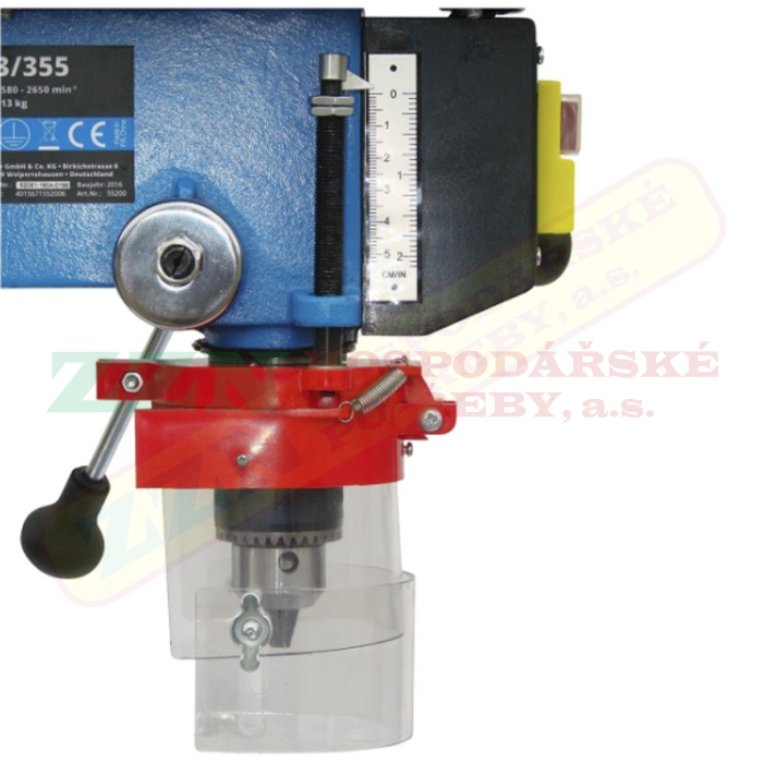 5 rychlostních stupňů otáčení vřetena (› 580/850/1220/1650/2650/min.; manuální nastavení pomocí řemenic), vrtací hlavička pro nástroje a vrtáky O 1 - 13 mm (› házivost: < 0,02 mm).