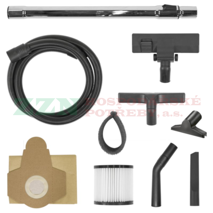Příslušenství: vysávací hubice (podlahová, na suché/mokré nečistoty, spárová, na čalounění), teleskopická kovová trubka, 3 m sací hadice (vnitřní průměr: 35 mm), HEPA filtr, pěnový filtr, 30 l papírový pytel.