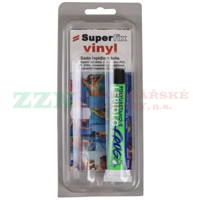 Superfix Vinyl sada. Sadu tvoří 25 ml polyuretanového lepidla + 150 cm2 fólie na lepení výrobků z měkkého PVC jako jsou např. nafukovací bazény, míče, plovací kola, pláštěnky, čluny, matrace a další. Bazénovou fólií lze lepit i pod vodou.