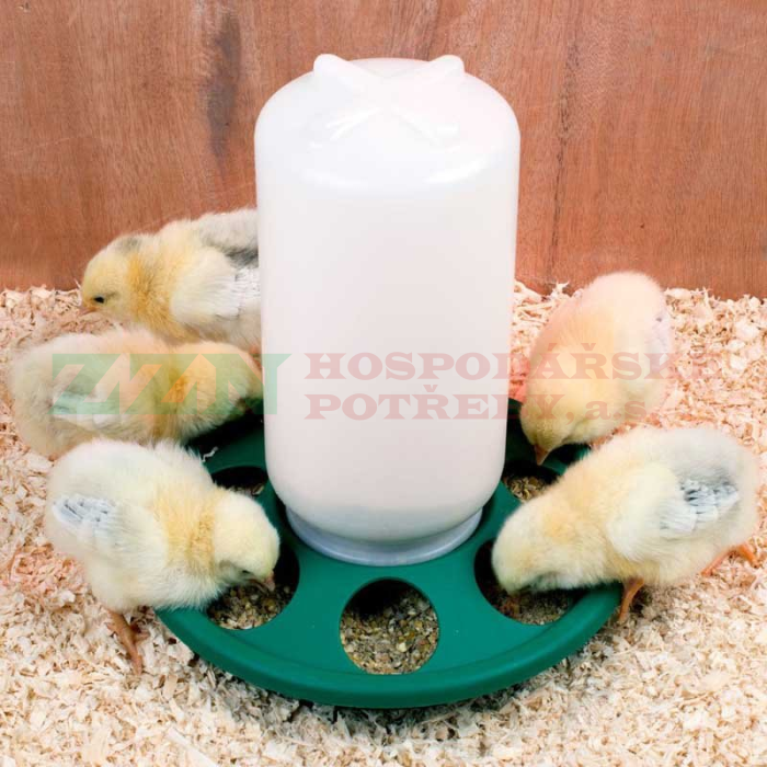 Kloboukové krmítko s kulatými otvory pro kuřata.