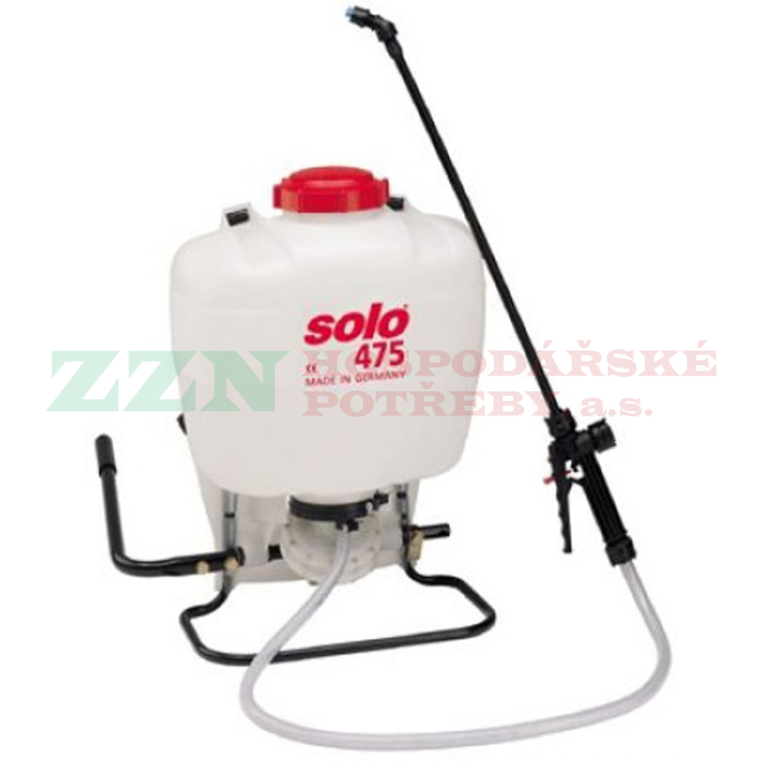 Zádový tlakový postřikovač SOLO 475 s nádrží na postřik o objemu 15 l. Je vhodný pro aplikaci postřiků na ochranu rostlin a různých čistících a dezinfekčních prostředků. Postřikovač je vyrobený z pevných lehkých plastů odolných proti záření UV. Postřiková kapalina se tlakuje ve vzdušníku uvnitř nádrže pomocí tlakovací páky. Tlakovací páka se dá nainstalovat vlevo nebo vpravo - dle potřeby obsluhy - levák nebo pravák. Tlakuje se průběžně při aplikaci. Tlak kapaliny se reguluje nastavením ventilu na vzdušníku. Postřikovač je vybavený membránovým čerpadlem, které je vhodné i pro tlakování viskózních postřiků. Tvar nádrže je uzpůsobený k pevnému dosednutí na záda a na nádrži je vyznačená stupnice množství obsahu kapaliny. Postřikovač je nesený na širokých polstrovaných popruzích. Hadice mezi nádrží a ovládacím ventilem integrovaným v rukojeti je dlouhá asi 150 cm a umožňuje tak široký rádius ovládání. Součástí dodávky je štěrbinová tryska pro plošný postřik a tryska pro kruhový postřik (dutý kužel). Jako příslušenství se dodávají trubky různých délek a z různých materiálů, kryty postřiku, různé typy trysek, manometry atd.