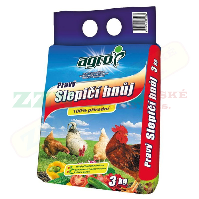 Agro Pravý slepičí hnůj je organické hnojivo vyrobené z drůbeží podestýlky s přidáním melasy, melasových výpalků.