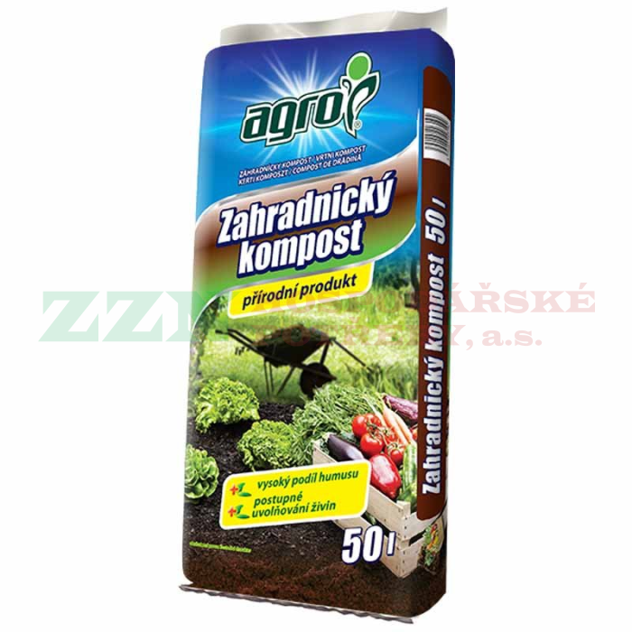 • AGRO Zahradnický kompost s vysokým obsahem humusu je 100% přírodní materiál sloužící k základnímu hnojení venkovních záhonů, do skleníků a při výsadbě okrasných ovocných stromů.