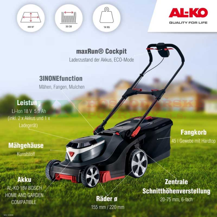 • Díky inovativním komponentům, jako je lithium-iontový akumulátor s indikátorem stavu nabití a ovládací panel maxRun je AL-KO 382 Li Premium spolehlivým partnerem pro vaši zahradu.