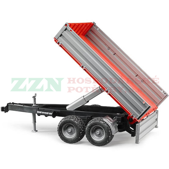 Věrná kopie dvounápravového přívěsu se sklopnou ložní plochou.