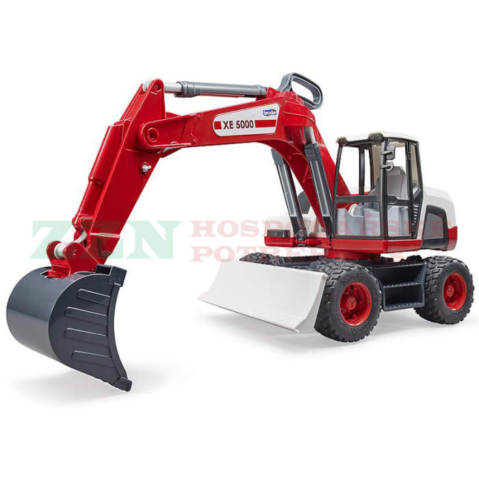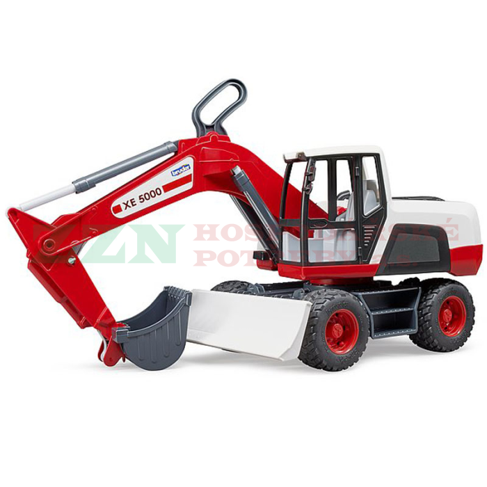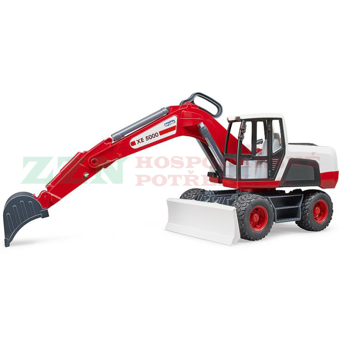 Kolový bagr Bruder 03411 v červenobílém provedení s funkčními prvky.