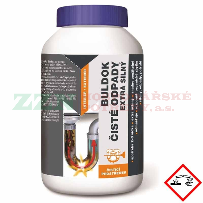 • BULDOK ČISTÉ ODPADY – EXTRA SILNÝ čistí, odmašťuje, rozpouští vlasy a jiné organické zbytky v sifonech a domovních odpadech z kuchyní, koupelen apod.