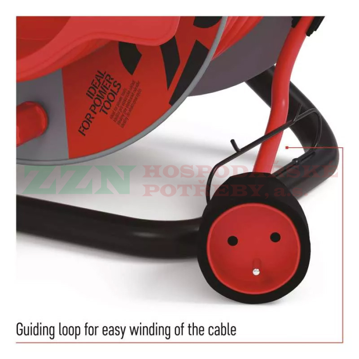 • Jeho výhodami jsou vodicí oko pro plynulé navinutí kabelu a brzda cívky, která brání samovolnému navíjení.