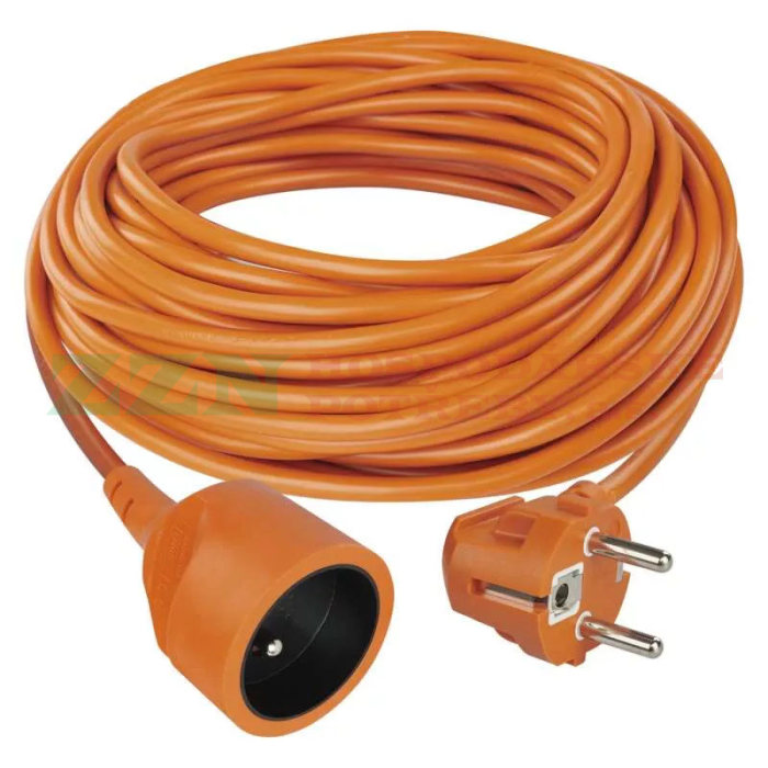 • Oranžový prodlužovací přívod s jednou zásuvkou - spojka, délkou 20 m a průřezem vodiče 1,5 mm2.