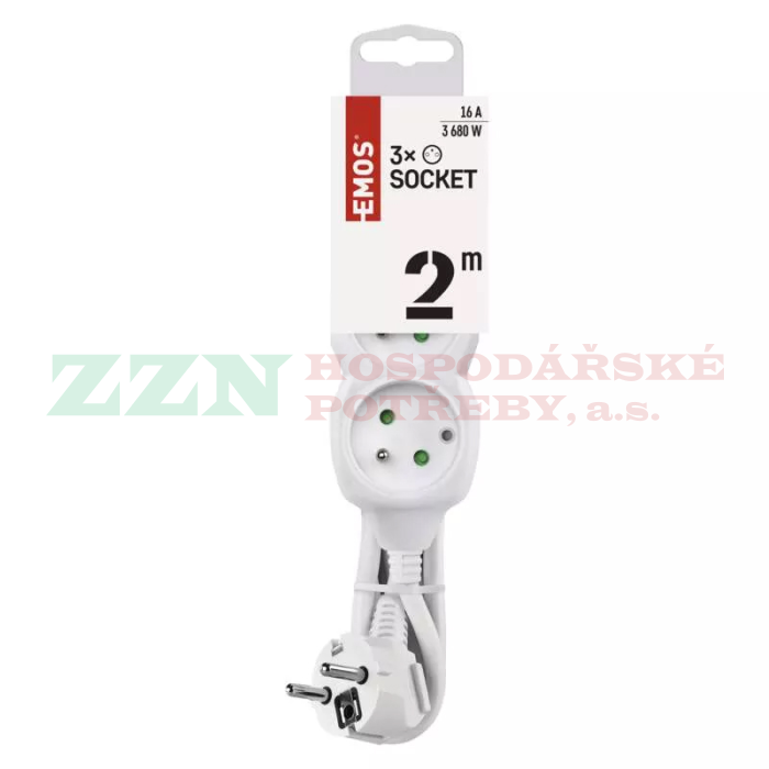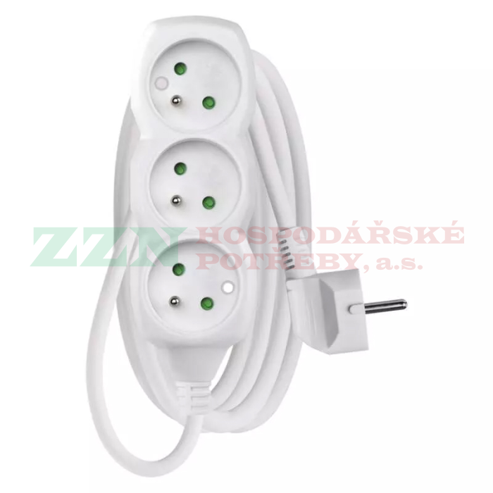 • Bílý prodlužovací přívod, 3 zásuvka s délkou 2 m a průřezem vodiče 1 mm2.