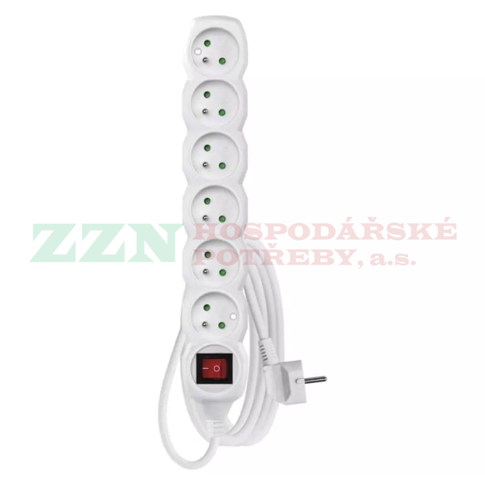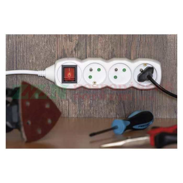• Bílý prodlužovací přívod, 5 zásuvek s délkou 3 m a průřezem vodiče 1 mm2.