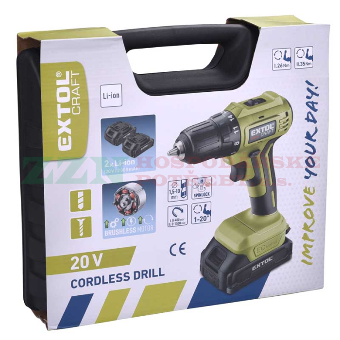 EXTOL Craft Aku vrtací šroubovák, BRUSHLESS, 20V Li-ion, 2x2Ah, 402450