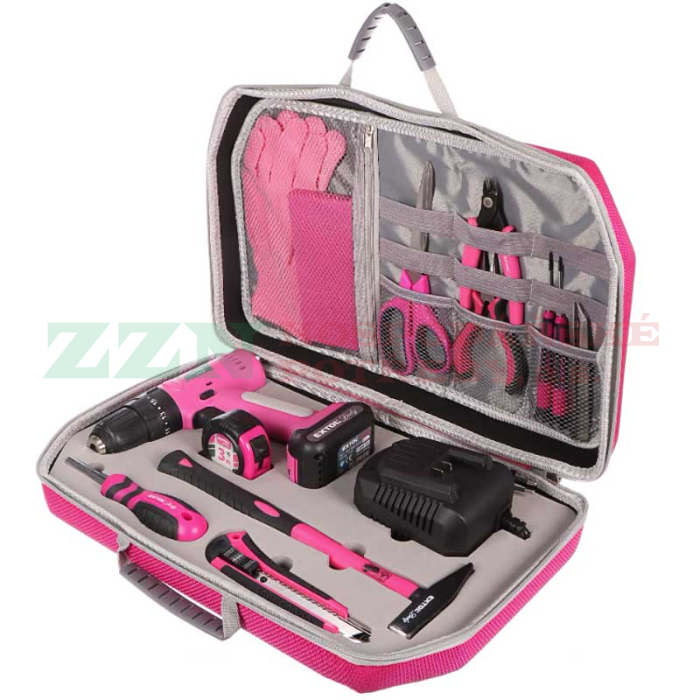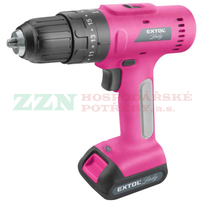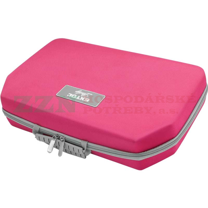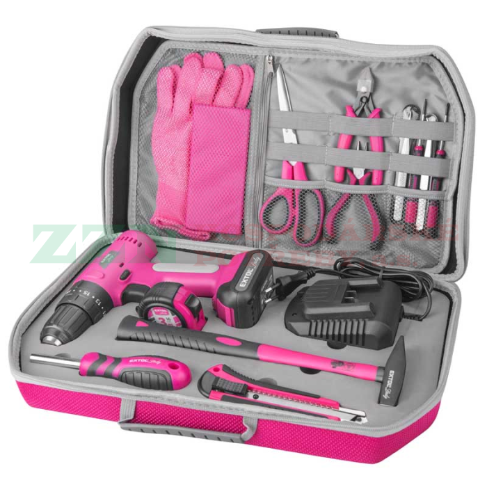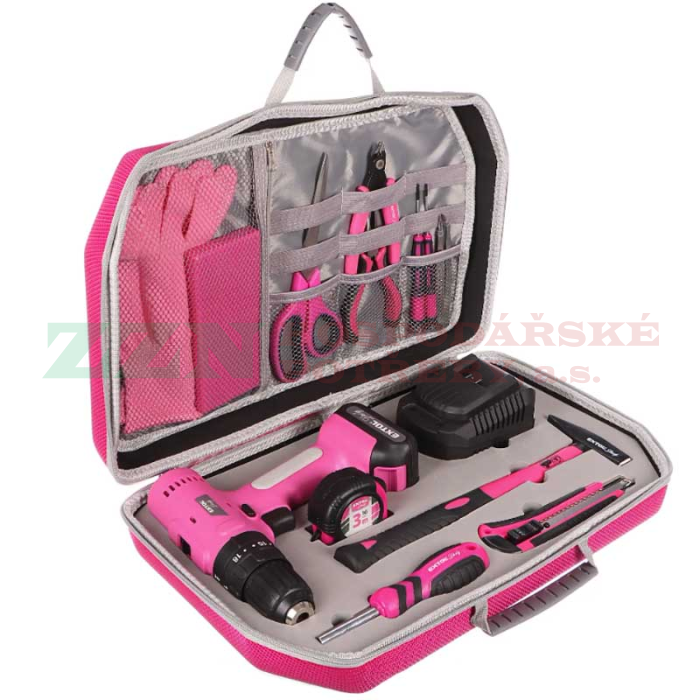 EXTOL Lady Aku vrtací šroubovák s příklepem, růžový, 12V Li-ion, 2000mAh, v kufru s nářadím, sada 27ks, 402403