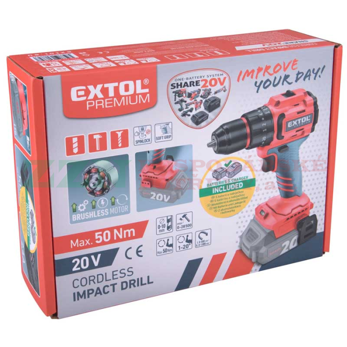 EXTOL Premium Aku vrtací šroubovák s příklepem, SHARE20V, BRUSHLESS, 2 Ah, 8891808