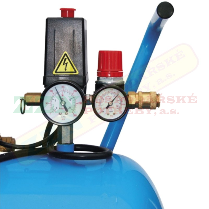 Vybavení: 2 manometry, 2 výstupy tlakového vzduchu (› kovové rychlospojky), tlakový spínač, redukční ventil, pojistný přetlakový ventil, zpětný ventil, olejoznak, vzduchové filtry (2), 1,8 m přípojný elektrický kabel H07 RN-F.