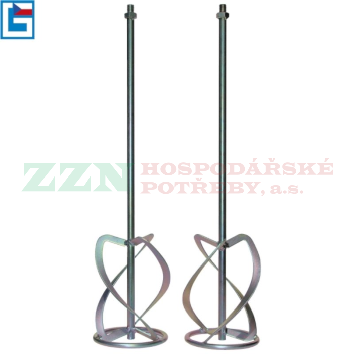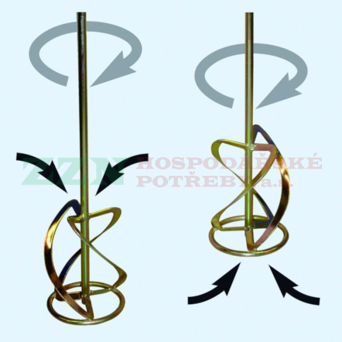 Konstrukce: obouruční rámová rukojeť s měkkou tlumicí vložkou, 2 spirálové míchací metly (pro jemnozrnné/hrubozrnné stavební hmoty; průměr koše: 140 mm).
