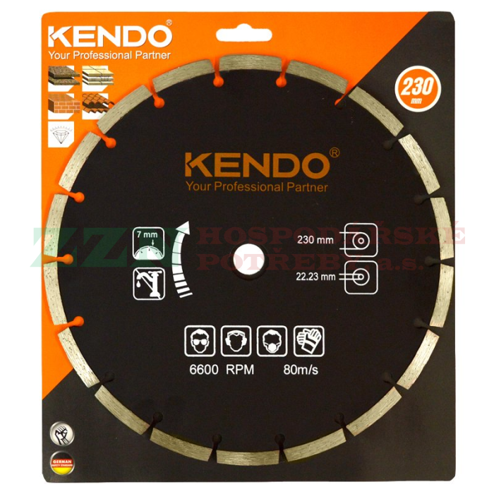 KENDO Řezný diamantový segmentový kotouč o průměru 230 mm, výškou segmentu 7 mm, určený pro řezání běžných stavebních materiálů - betonu, armovaného betonu, asfaltu, zdiva, kamene atp.