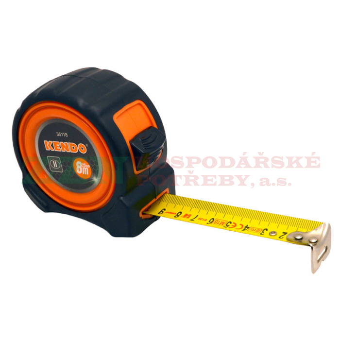 KENDO Svinovací pogumovaný metr 8 m s šířkou pásku 25 mm, vyrobený z tvrzeného ABS plastu a TPR.