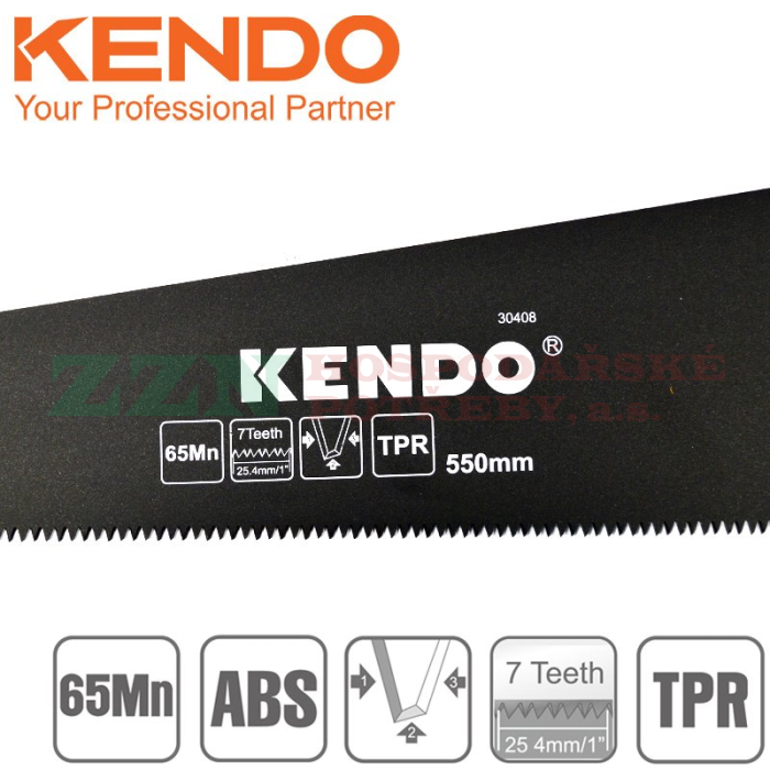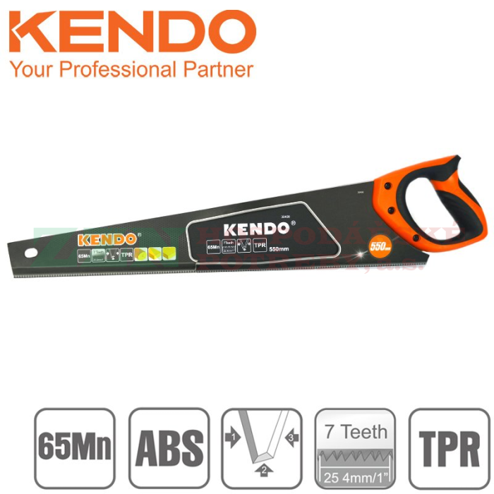 KENDO Ruční pilka ocaska pro jednoruční řezání dřeva s délkou ostří 550 mm, speciální teflonovou povrchovou úpravou proti korozi, rukojetí z měkkého bi-materiálu v kombinaci pryže a gumy a tvrzenými kalenými zuby pro rychlé řezání.