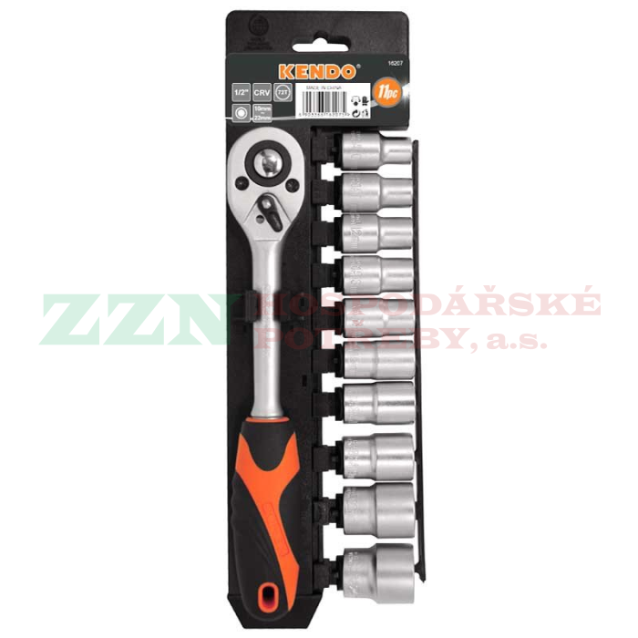 KENDO Ráčna (72T) se sadou hlavic (10,11,12,13,14,15,17,19,22,24) o rozměru 1/2", vyrobená z kalené chrom-vanadiové oceli.