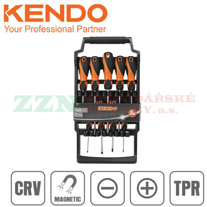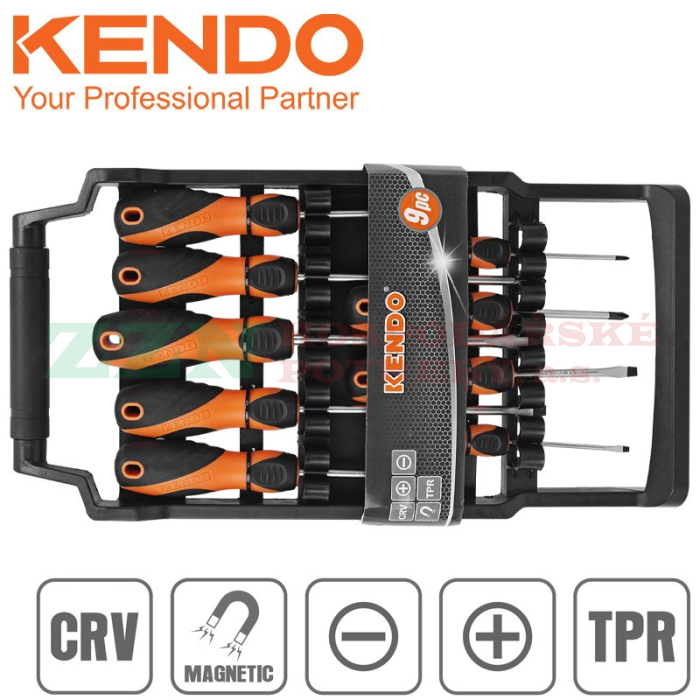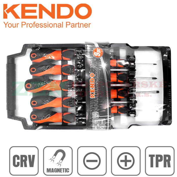 KENDO Sada šroubováků 9 dílná, vyrobená z chrom-vanadiové oceli - ploché 3x75, 5x75, 6x100, 6x150, 8x150mm; křížové PH0x75, PH1x75, PH2x100, PH2x150mm.