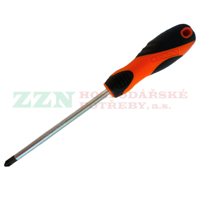 KENDO Křížový šroubovák s rukojetí z TPR pryže v kombinaci s plastem, CrV kov v matové úpravě.