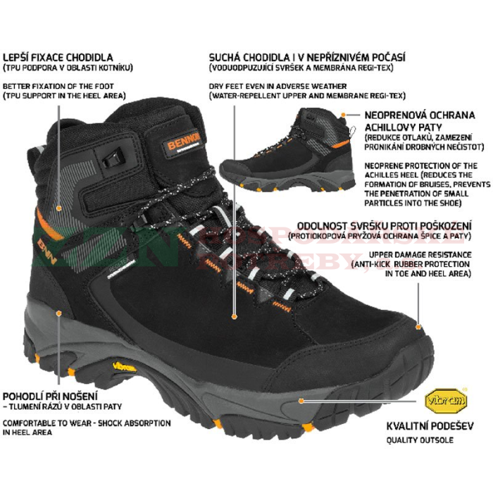 • Obuv je vybavena voděodolnou membránou REGI-TEX, která chrání chodidla před mokrem a vlhkem.