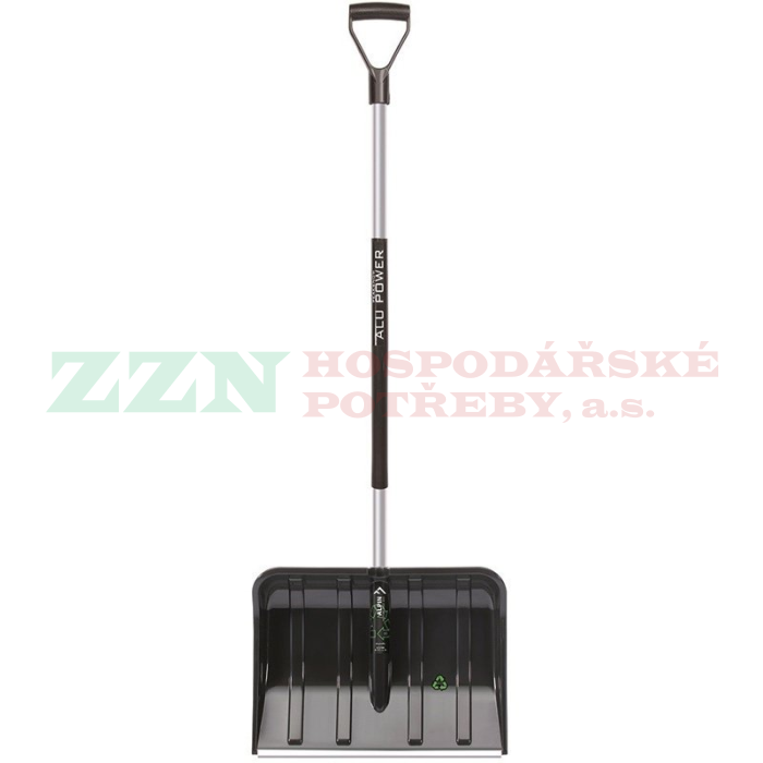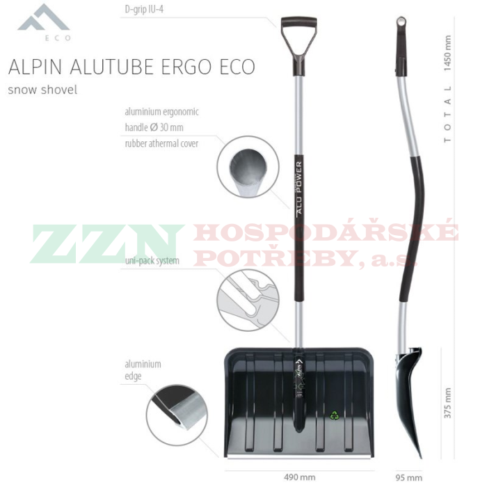 • Plastová lopata na sníh ALPIN ERGO ECO je vybavená odolnou ručkou a hliníkovou ergonomickou násadou.