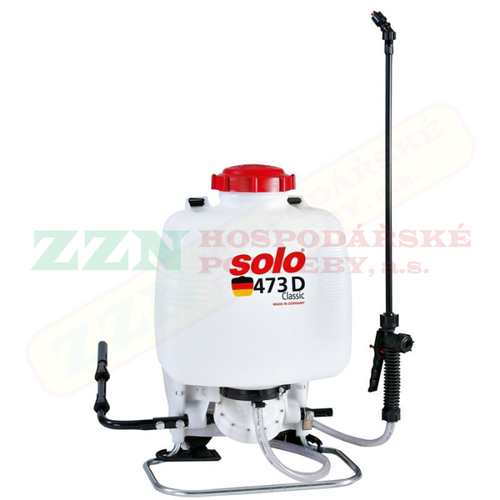 Zádový tlakový postřikovač SOLO 473 D s nádrží na postřik o objemu 12 l. Je vhodný pro aplikaci postřiků na ochranu rostlin a různých čistících a dezinfekčních prostředků. Postřikovač je vyrobený z pevných lehkých plastů odolných proti záření UV. Postřiková kapalina se tlakuje ve vzdušníku uvnitř nádrže pomocí tlakovací páky. Tlakovací páka se dá nainstalovat vlevo nebo vpravo - dle potřeby obsluhy - levák nebo pravák. Tlakuje se průběžně při aplikaci. Postřikovač je vybavený membránovým čerpadlem, které je vhodné i pro tlakování viskózních postřiků. Tvar nádrže je uzpůsobený k pevnému dosednutí na záda a na nádrži je vyznačená stupnice množství obsahu kapaliny. Postřikovač je nesený na širokých polstrovaných popruzích. Hadice mezi nádrží a ovládacím ventilem integrovaným v rukojeti je dlouhá asi 150 cm a umožňuje tak široký rádius ovládání. Součástí dodávky je štěrbinová tryska pro plošný postřik a tryska pro kruhový postřik (dutý kužel).