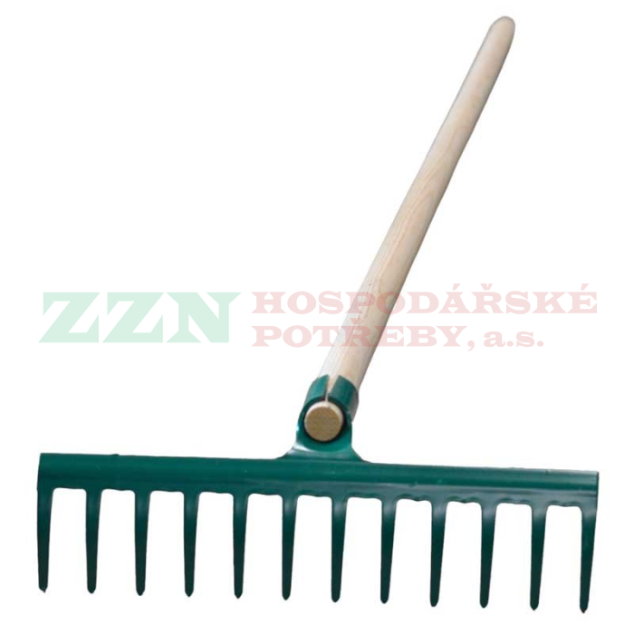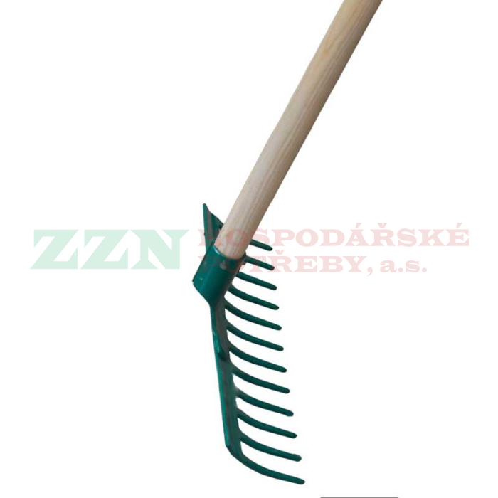 Kovové hrábě s 12 zuby a dřevěnou násadou.